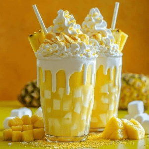 - Cubra seu shake com uma generosa porção de chantilly e polvilhe granulado amarelo por cima. Decore com pedaços de abacaxi, fatias de limão e alguns marshmallows alegres para um toque extra de diversão